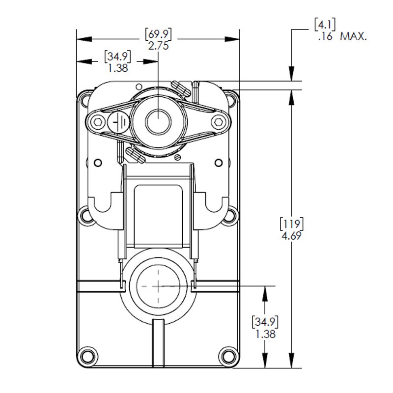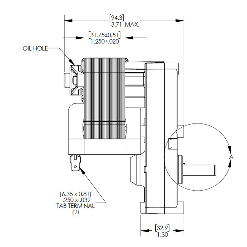 Par de salida 90 IN/LBS MIN., consumo 48,8 Watt, velocidad 5,6 rpm, sentido de rotación horario, diámetro eje 9,53 mm, núcleo ferromagnético 31,75 mm, alimentación 230 V CA - 50 Hz