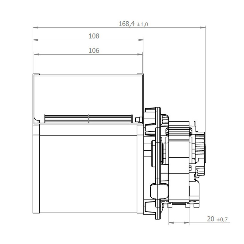 Di dimensioni lunghezza totale 131,5 mm, dimensioni bocchetta uscita aria: 108x50 mm.