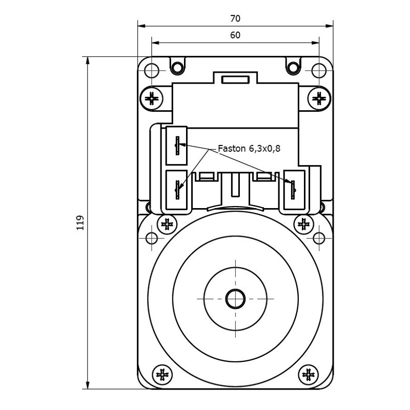 Coppia nominale 28 Nm, assorbimento 20 Watt, velocità 2 rpm, rotazione oraria o antioraria in base al collegamento, diametro albero 9,5 mm, alimentazione 230V - 50 Hz.