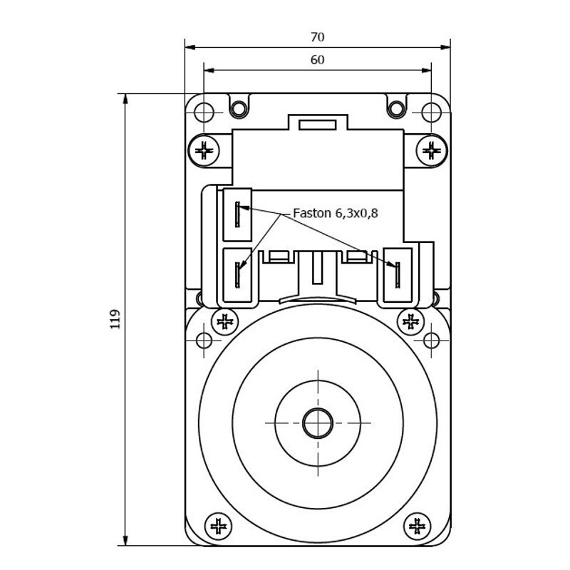 Coppia nominale 16 Nm, assorbimento 20 Watt, velocità 4 rpm, rotazione oraria o antioraria in base al collegamento, diametro albero 9,5 mm, alimentazione 230V - 50 Hz.