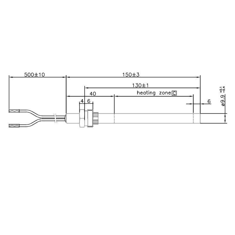 Esecuzione con raccordo filettato 3/8" GAS, diametro 9,9 mm, lunghezza totale 150 mm, lunghezza sottobattuta 130 mm, 250 Watt.
