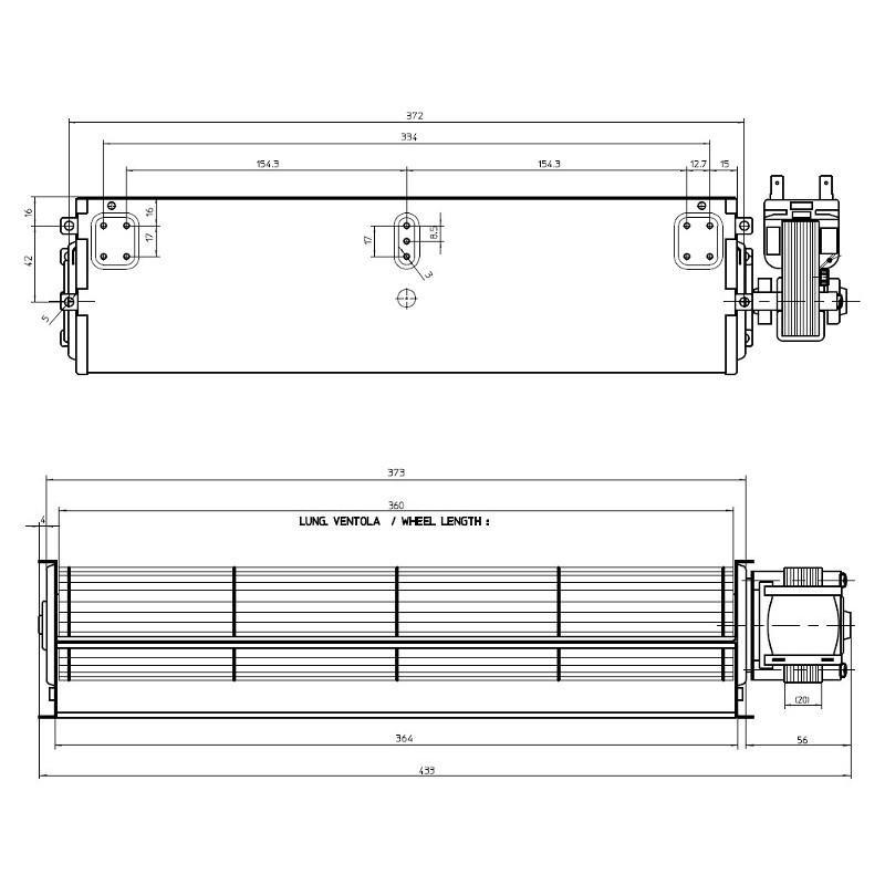 Inoltre le ridotte dimensioni, lunghezza totale 433 mm, dimensioni bocchetta uscita aria: 364x40 mm, consentono al ventilatore tangenziale una più facile adattabilità a diverse applicazioni.