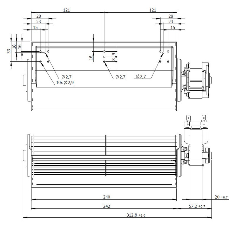 Lunghezza totale 312,8 mm, dimensioni bocchetta uscita aria: 242x53 mm.